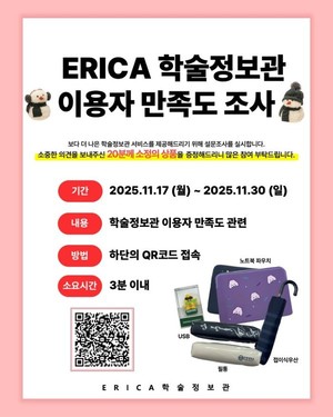ERICA 학술정보관이 재학생 및 구성원을 대상으로 2025학년도 이용자 만족도 조사를 실시한다. 이번 조사는 학술정보관의 현재 운영 상태를 점검하고, 향후 보다 나은 시설과 서비스를 제공하기 위한 기초 자료로 활용될 예정이다.설문은 11월 30일(일)까지 진행되며, 문항 수는 약 20개, 소요 시간은 약 3분 이내로 간단하게 작성 가능하다. 참여 방법은 하단의 설문 링크 또는 포스터 속 QR코드를 통해 구글폼 접속 후 응답하면 된다. 설문에 참여한 학생들 가운데 20명을 추첨해 USB, 필통, 접이식 우산, 노트북 파우치 등 기념