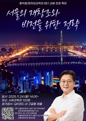 한양대 정치외교학과가 오는 24일 14시부터 16시까지 서울캠퍼스 사회과학관 103호에서 전 국회의원 홍익표(정치외교학과 85) 동문 초청 강연 ‘서울의 재창조와 비전을 위한 전략’을 진행한다. 이번 강연은 한양대학교 학생이라면 누구나 참여할 수 있다.참여 방법은 포스터 좌측 하단에 위치한 QR코드를 통해 신청서를 제출하면 된다. 강연에 대한 자세한 내용은 한양대 정치외교학과 학생회 인스타그램(바로가기)에 게시된 카드뉴스를 통해 확인할 수 있다.