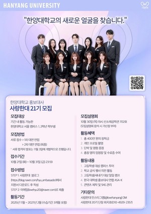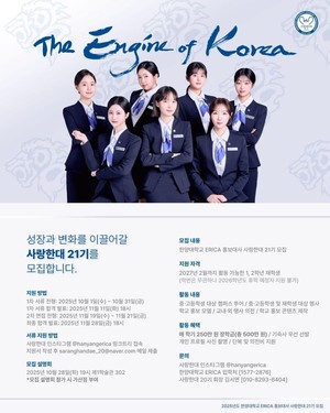 한양대학교 ERICA의 대표 홍보대사 '사랑한대' 21기 모집이 10월 31일 23시 59분까지 진행된다. 지원 대상은 한양대학교 ERICA 1·2학년 재학생으로, 2026학년도 휴학 예정자는 지원할 수 없다. 1차 서류전형과 2차 면접전형을 거쳐 선발될 예정이다. 사랑한대는 학교를 대표해 다양한 홍보 활동과 행사를 기획·운영하는 학생 홍보대사단이다. 중·고등학생을 대상으로 한 캠퍼스 투어 및 홍보, 재학생 대상 행사, 학교 홍보 모델, 콘텐츠 제작 등의 업무를 맡는다. 매 학기 250만 원의 장학금을 받을 수 있다. 모집 기간 중