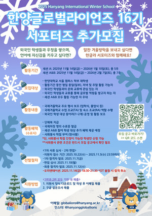 한양대 국제교류팀에서 '한양글로벌라이언즈 16기 서포터즈'를 추가 모집한다. 한양글로벌라이언즈는 국제겨울학교 프로그램 운영, 행사 지원, 외국인 학생 대상 동아리 활동 보조 등의 역할을 맡는다. 활동 기간은 세션 A(5주)와 세션 A&B(7주) 중 선택할 수 있다.지원 자격은 2025학년도 2학기 학부 재학생이다. 일정 조정이 원활하고 외국인 학생들과의 문화 교류에 관심이 있는 지원자, 세션 A·B 모두 참여 가능한 지원자는 선발 시 우대 대상이다. 서포터즈로 최종 선발된 학생에게는 단체복 지급, 국제처장 명의 수료증, 사회봉사 학