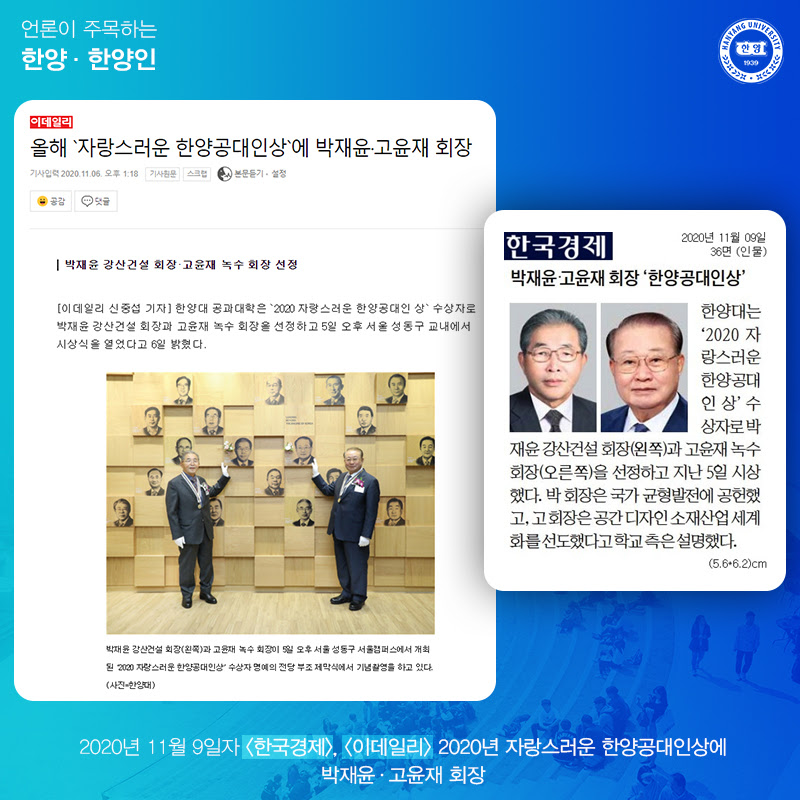 5. 2020 자랑스러운 한양공대인상을 받은 박재윤, 고윤재 회장에 대한 내용이 소개됐습니다.