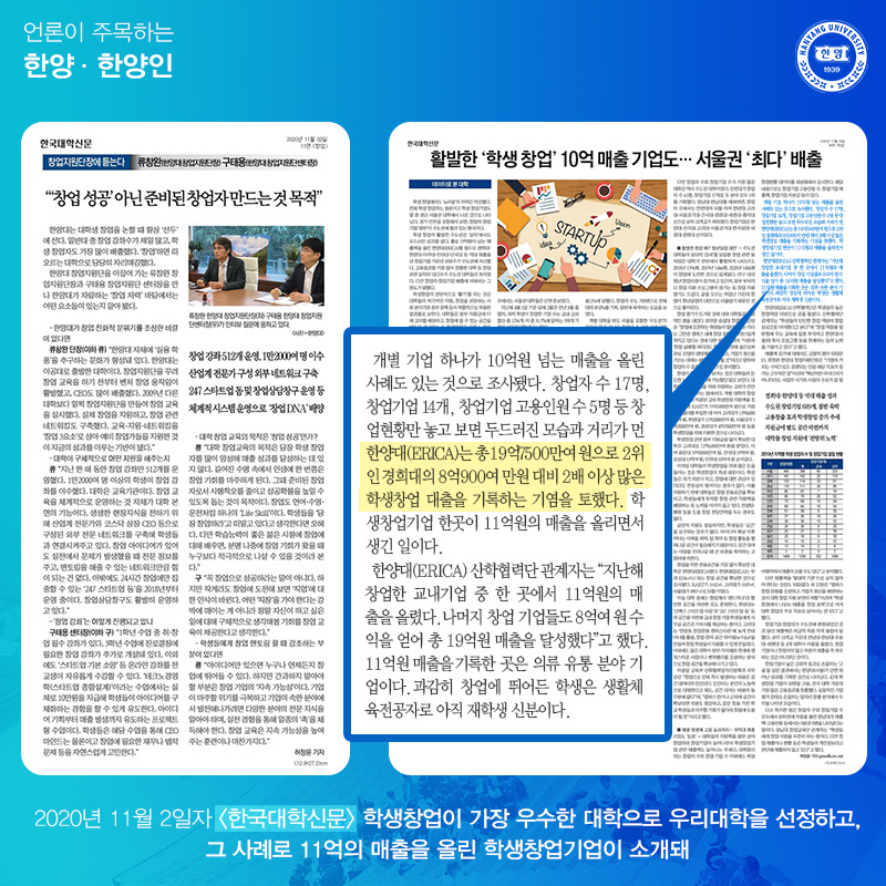 3. 학생 창업이 가장 우수한 대학으로 한양대를 꼽았고, 그 사례로 연 11억 이상 매출을 올린 ERICA캠퍼스 재학생이 창업한 기업이 소개됐습니다.