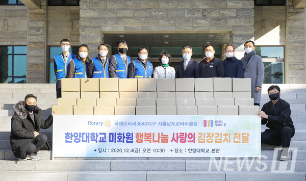 국제로타리 3640지구 서울남도로타리클럽(총재 조희술)이 12월 4일 한양대학교 본관 앞 광장에서 김치 기부 전달식을 개최했다. "한양대 미화원 행복나눔 사랑의 김장김치 전달"이라는 이름으로 총 1,000kg의 김치가 한양대 미화원에게 전달돼 추운 날씨 가운데도 따뜻한 정을 나누는 자리로 의미를 더했다.