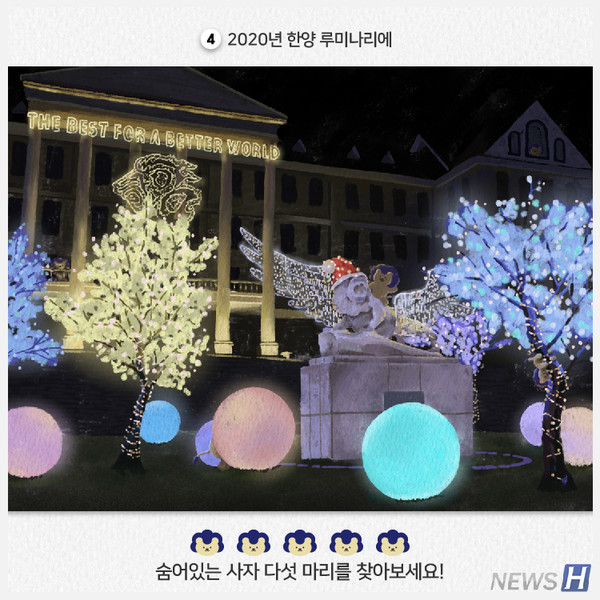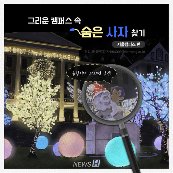 한양대학교는 지난 21일을 끝으로 2020년 2학기 종강을 맞았다. 종강을 맞이해 조금은 여유가 생겼지만, 동시에 아쉬움도 크다. 2020년은 코로나19로 인해, 개강 이후에도 학교에 오지 못한 채 수업을 듣는 경우가 많았다. 특히 대부분의 한양인은 비대면 원격수업 등 코로나19로 바뀐 교육 환경에 적응하며 어려움을 겪기도 했고, 예쁜 캠퍼스에서의 학교생활도 즐기지 못했다. 힘들고 아쉬운 한 해를 마치는 한양인들을 위로하고자, ‘숨은 사자 찾기’ 일러스트를 준비했다. 한양대 서울캠퍼스 4곳의 풍경이 담긴 일러스트 곳곳에 숨어있는 사자를 찾으면 된다. 한양의 상징 동물인 사자를 찾아보며 캠퍼스 풍경을 만끽하는 것은 어떨까? 캠퍼스에 대한 그리움이 조금은 사라질지도 모른다.