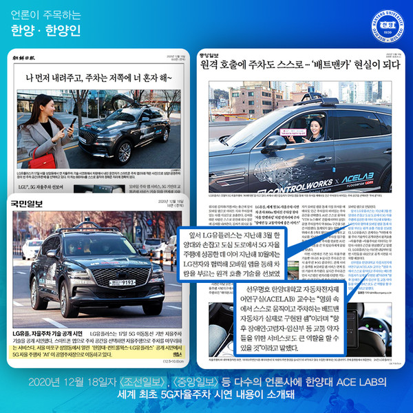 3. 한양대 ACE LAB이 컨트롤웍스, LG U+와 함께 '세계 최초 5G 자율주차' 시연에 관한 내용이 소개 됐습니다.