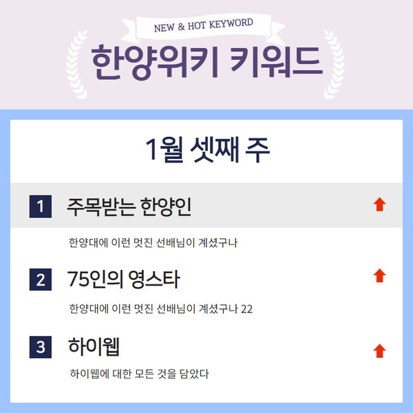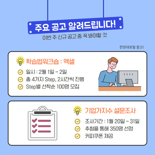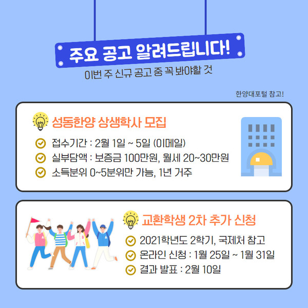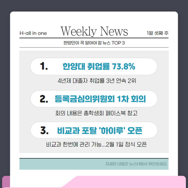 2021년 1월 셋째 주 "H-all in one(홀인원)". 주요 공고, 동문, 뉴스 및 위키 등을 모았습니다. 다만 모든 공고를 다루는 것이 아니며, 근로/단과대학 대상/타 기관 주관은 제외된다는 점 유의해주세요! 또한 이번 주부터 한양제일리뷰대회의 수상작들이 한편씩 소개됩니다. 원문은 뉴스H에서(클릭 시 이동) 확인하세요~!