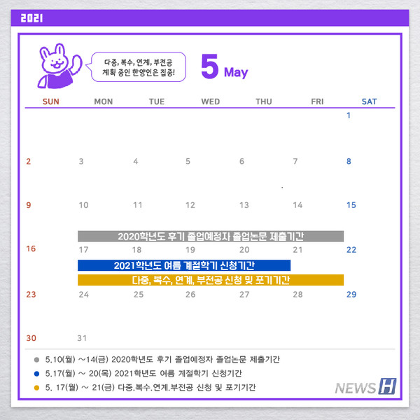 어느덧 2021년 1월도 끝나가고, 새로운 학기를 준비하는 2월이 다가오고 있다. 곧 있을 1학기 수강신청 등 다양한 상반기 일정을 정리하기 위해, 1월을 제외한 2021학년도 상반기 학사 일정을 다이어리 형식으로 제작했다. 자세한 학사 일정은 한양대학교 홈페이지 광장 탭과 한양 위키에서 확인할 수 있다.