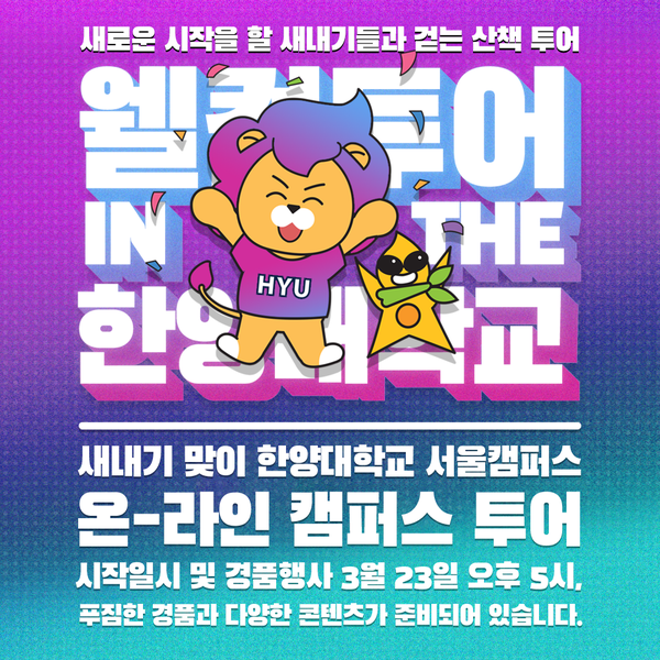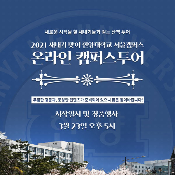 한양대 2021학번 주목!! 2021년 3월 23일(화) 오후 5시, 새내기만을 위한 특별한 투어가 시작됩니다. #온라인캠퍼스투어 #다양한콘텐츠 #푸짐한경품 #한양대2021학번 뉴스H newsh@hanyang.ac.kr 다른기사 보기 저작권자 © 뉴스H 무단전재 및 재배포 금지 당신만 안 본 뉴스 [포토스토리] "AI 시대 해답은 브랜딩", 오세훈 서울시장의 경영학 특강 현장 Into the Creation 2025, 창작자들의 꿈에 날개를 이찬규 학생, 사이버·우주 융합연구로 2025 사이버안보논문공모전 대상 수상 한양대, '2026 QS 지속가능성 순위' 세계 161위, 국내 4위 기록 해커톤에서 인턴십까지, 현대차 사내 스타트업에 다녀오다 [창업지원단 인턴십 경험기] [포토스토리] 한양 속에 사회혁신을 품다, SSIR 먼슬리 콜로키움 현장 행복은 좋은 경험의 ‘빈도’에서, 서은국 교수와 함께한 한양인의 힐링콘서트 현장 [포토스토리] "AI 시대 해답은 브랜딩", 오세훈 서울시장의 경영학 특강 현장 댓글삭제 삭제한 댓글은 다시 복구할 수 없습니다. 그래도 삭제하시겠습니까? 비밀번호 닫기 기사 댓글 0 댓글 접기 로그인 후 이용 가능합니다. 댓글 내용입력 비회원 로그인 이름 비밀번호 댓글 내용입력 댓글쓰기 계정을 선택하시면 로그인·계정인증을 통해 댓글을 남기실 수 있습니다. 회원 로그인 비회원 글쓰기 이름 비밀번호 자동등록방지 로그인 옵션 창닫기 기획기사 [포토스토리] "AI 시대 해답은 브랜딩", 오세훈 서울시장의 경영학 특강 현장 Into the Creation 2025, 창작자들의 꿈에 날개를 해커톤에서 인턴십까지, 현대차 사내 스타트업에 다녀오다 [창업지원단 인턴십 경험기] [포토스토리] 한양 속에 사회혁신을 품다, SSIR 먼슬리 콜로키움 현장 행복은 좋은 경험의 ‘빈도’에서, 서은국 교수와 함께한 한양인의 힐링콘서트 현장 [카드뉴스] '한양대학교 SDGs? 알고 보니 내 일상 속에 있었다!' 1편