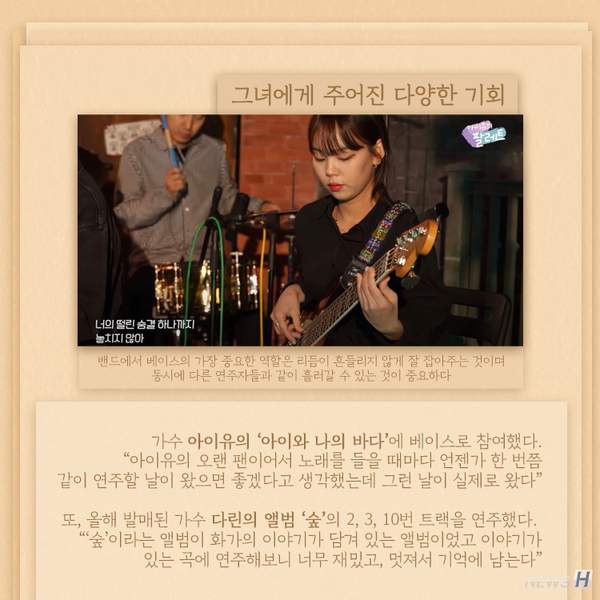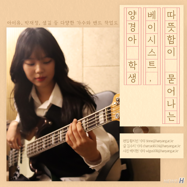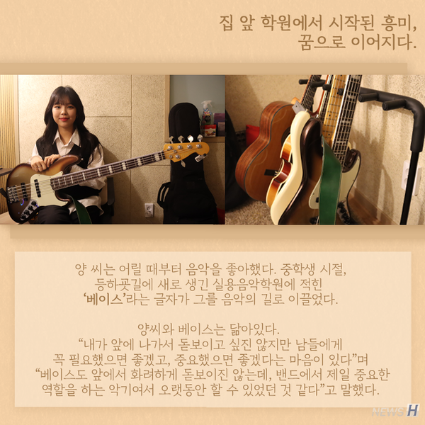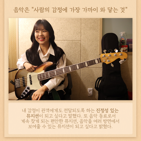 양경아(실용음악학과 4) 씨는 다양한 가수와 작업을 하며 베이시스트로서의 활동을 이어가고 있다. 그녀의 음악 이야기와 음악에 대한 생각을 카드뉴스에 담았다.