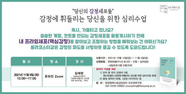 게시 기간 : 2021.10.18 ~ 2021.10.31 관련기사 한양인의 지친 마음을 치유하다, ERICA캠퍼스 한양행복드림상담센터 미디어보드 newsh@hanyang.ac.kr 다른기사 보기 저작권자 © 뉴스H 무단전재 및 재배포 금지 당신만 안 본 뉴스 [포토스토리] "AI 시대 해답은 브랜딩", 오세훈 서울시장의 경영학 특강 현장 Into the Creation 2025, 창작자들의 꿈에 날개를 이찬규 학생, 사이버·우주 융합연구로 2025 사이버안보논문공모전 대상 수상 한양대, '2026 QS 지속가능성 순위' 세계 161위, 국내 4위 기록 해커톤에서 인턴십까지, 현대차 사내 스타트업에 다녀오다 [창업지원단 인턴십 경험기] [포토스토리] 한양 속에 사회혁신을 품다, SSIR 먼슬리 콜로키움 현장 행복은 좋은 경험의 ‘빈도’에서, 서은국 교수와 함께한 한양인의 힐링콘서트 현장 2025 중앙일보 대학평가 서울 3위, ERICA 13위 댓글삭제 삭제한 댓글은 다시 복구할 수 없습니다. 그래도 삭제하시겠습니까? 비밀번호 닫기 기사 댓글 0 댓글 접기 로그인 후 이용 가능합니다. 댓글 내용입력 비회원 로그인 이름 비밀번호 댓글 내용입력 댓글쓰기 계정을 선택하시면 로그인·계정인증을 통해 댓글을 남기실 수 있습니다. 회원 로그인 비회원 글쓰기 이름 비밀번호 자동등록방지 로그인 옵션 창닫기 기획기사 [포토스토리] "AI 시대 해답은 브랜딩", 오세훈 서울시장의 경영학 특강 현장 Into the Creation 2025, 창작자들의 꿈에 날개를 해커톤에서 인턴십까지, 현대차 사내 스타트업에 다녀오다 [창업지원단 인턴십 경험기] [포토스토리] 한양 속에 사회혁신을 품다, SSIR 먼슬리 콜로키움 현장 행복은 좋은 경험의 ‘빈도’에서, 서은국 교수와 함께한 한양인의 힐링콘서트 현장 [카드뉴스] '한양대학교 SDGs? 알고 보니 내 일상 속에 있었다!' 1편