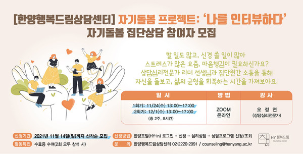 관련기사 한양대 간호학부, 메타버스 활용한 진로 상담 멘토링 진행 한양행복드림상담센터, 타로카드를 활용한 ‘자기이해’ 집단프로그램 운영 한양인의 지친 마음을 치유하다, ERICA캠퍼스 한양행복드림상담센터
