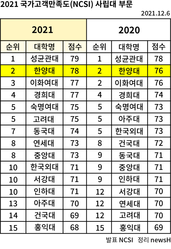 한양대학교가 한국생산성본부의 2021년 국가고객만족도조사(National Customer Satisfaction Index: NCSI, 이하 만족도조사)에서 2년 연속 2위에 올랐다.