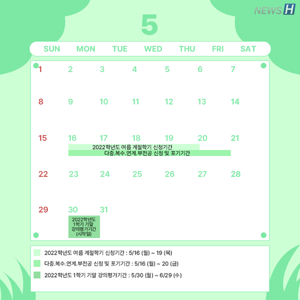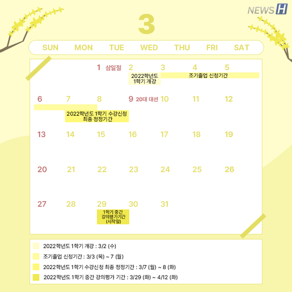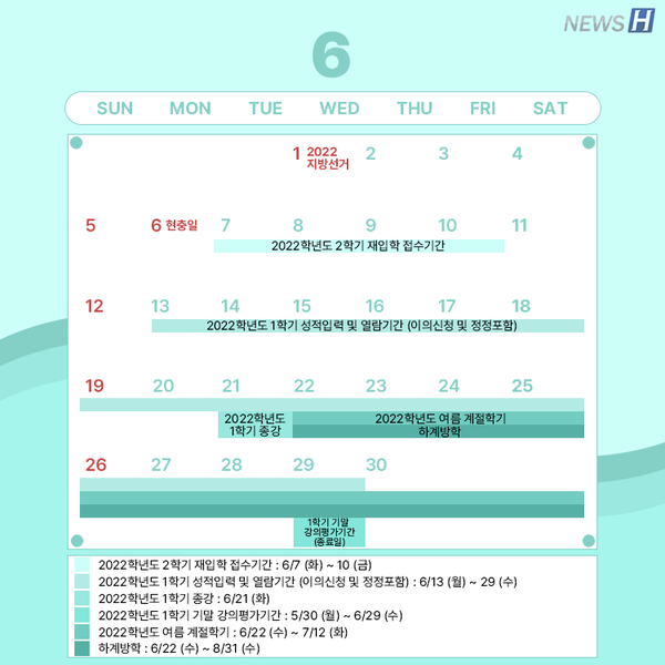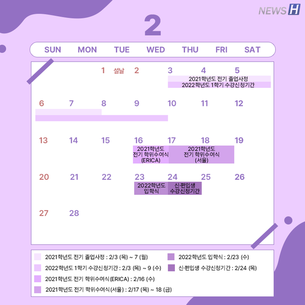 코로나19로 멈춰있던 일상을 점진적으로 회복하기 시작한 2021년이다. 변화하는 일상 속에서 다가오는 2022년 한양대의 일정이 궁금한 한양인을 위해 2022년 1학기 학사일정을 모았다. 새해 계획을 세우고 있는 한양인은 이 카드 뉴스를 참고해보자.
