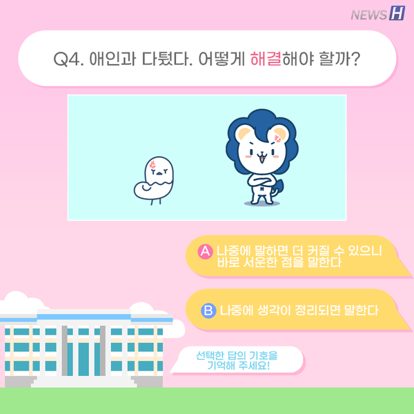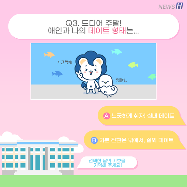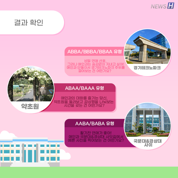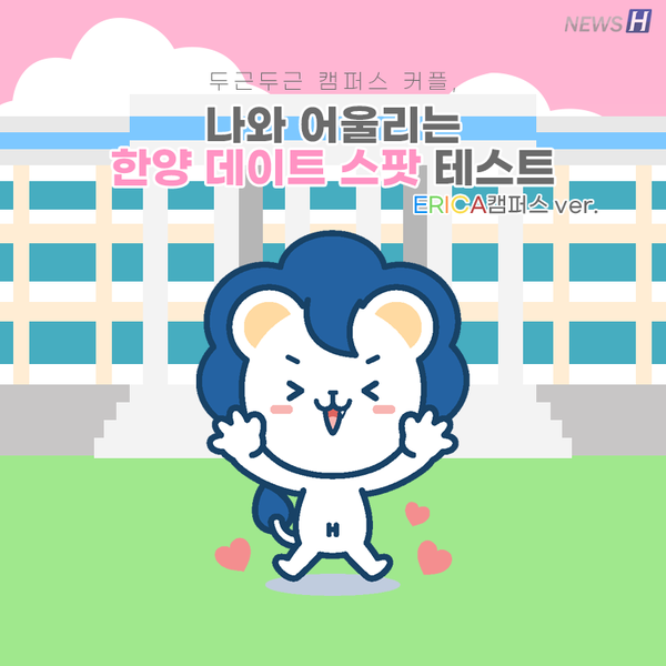 연인과 함께 낭만적인 대학 생활을 보내는 한양인을 위해 자신과 어울리는 한양 데이트 스팟 테스트를 준비했다. 결과는 총 6가지로, 다양한 연애 성향과 일치하는 ERICA캠퍼스 장소들이 준비돼있다. 자신의 연애 성향에 맞는 선택지에 답해보고 그와 어울리는 한양 데이트 스팟을 알아보자.