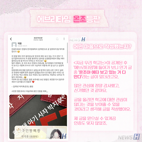 배우 박지후(연극영화학과 22) 씨가 한양대학교 22학번으로 입학했다. 한양대학교에서 빛나는 20살을 보낼 박 씨의 입학 소감을 비롯해 여러 가지 이야기를 담았다. 더 많은 이야기는 기사 원문에서 확인할 수 있다.