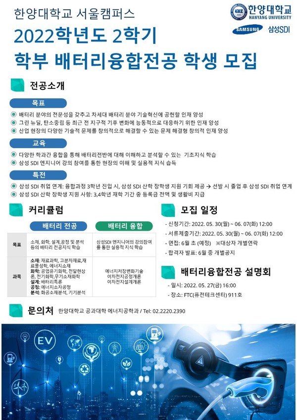 오는 5월 30일부터 6월 7일까지 배터리 분야 기술혁신을 주도할 학부 배터리융합전공 신입생을 모집한다. 2022-2학기에 신설되는 학부 배터리융합전공은 에너지공학과 및 관련분야 학과가 만든 다학제적 융합 전공으로 선발 시 3, 4학년 재학기간 동안 삼성SDI로부터 등록금 전액 및 생활비를 지원 받으며 졸업 후에는 삼성SDI에 취업하게 된다.