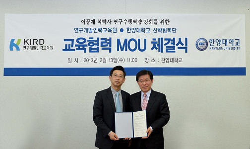 한양대 산학협력단(단장 최덕균)과 연구개발인력교육원(KIRD, 원장 김상선)은 13일 이공계 석·박사생의 국가 R&D(연구개발) 연구수행역량 강화를 위한 교육협력 MOU(양해각서)를 체결했다.