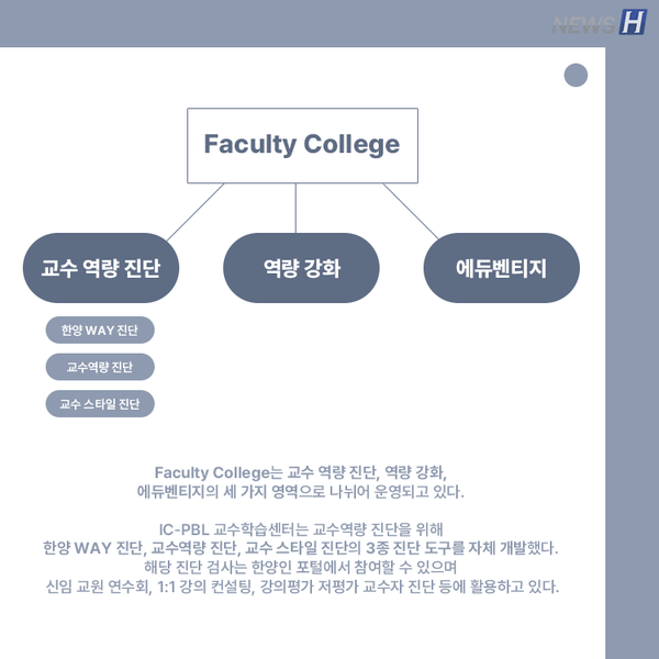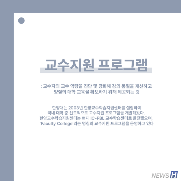 한양대는 교수자의 역량을 강화해 양질의 대학 교육을 제공하고자 교수지원 프로그램을 운영하고 있다. 양질의 대학 교육을 제공하고자 IC-PBL 교수학습센터에서 어떤 노력을 하고 있는지 이종호 창의융합교육원 교수가 전한다. 카드뉴스를 통해 확인해보자.