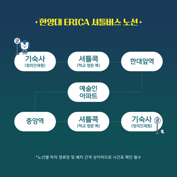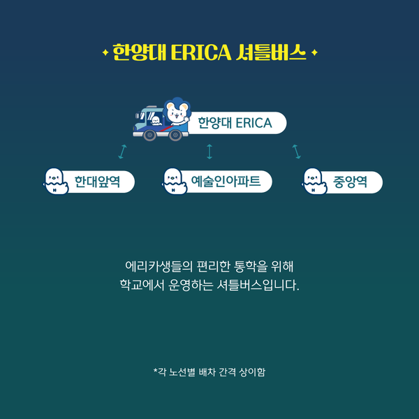 지금까지 알아두면 쓸데 있는 하냥인 잡학사전 <E키피디아> 셔틀버스 편을 알아보았습니다. 설레는 마음으로 향하는 등굣길, 한양대 ERICA의 셔틀버스와 함께하세요!