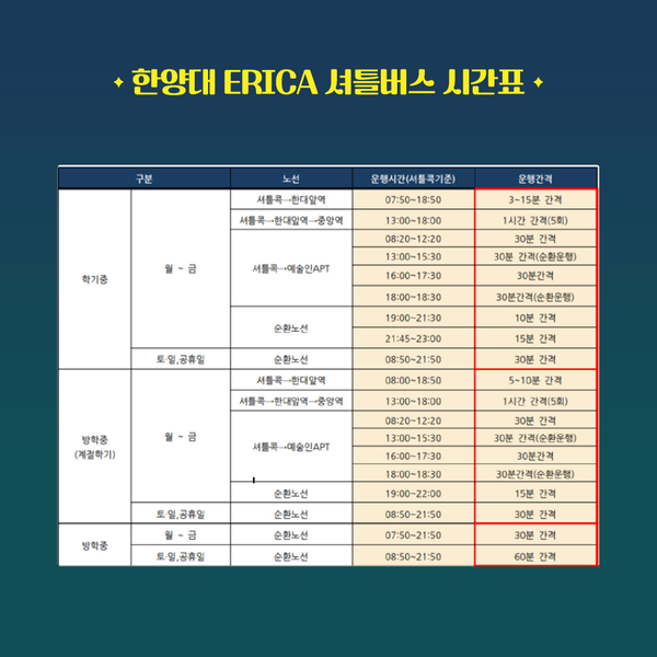 한양대 ERICA의 셔틀버스는 우리 학생들의 편리한 통학을 위해 학교에서 운영하는 무료 셔틀버스입니다. 셔틀버스는 기숙사(창의인재원)에서 출발하여 학교 정문 앞 셔틀콕, 한대앞역, 예술인 아파트, 중앙역을 거쳐 다시 학교로 돌아옵니다.