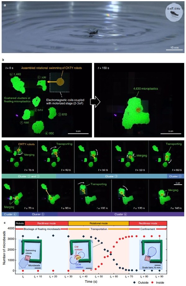 Professor Wie's magnetic robots is designed to be able to float on the surface of the water and swim quickly against the surface tension and drag of the water. This is because carbon nanotube yarn, which has high rigidity and low density, was used as the skeleton of the robot. As a result, their magnetic robots were able to swim in water at a speed up to twice that of the saltpier, as well as was able to transport and collect 4,000 microplastics within a few minutes.