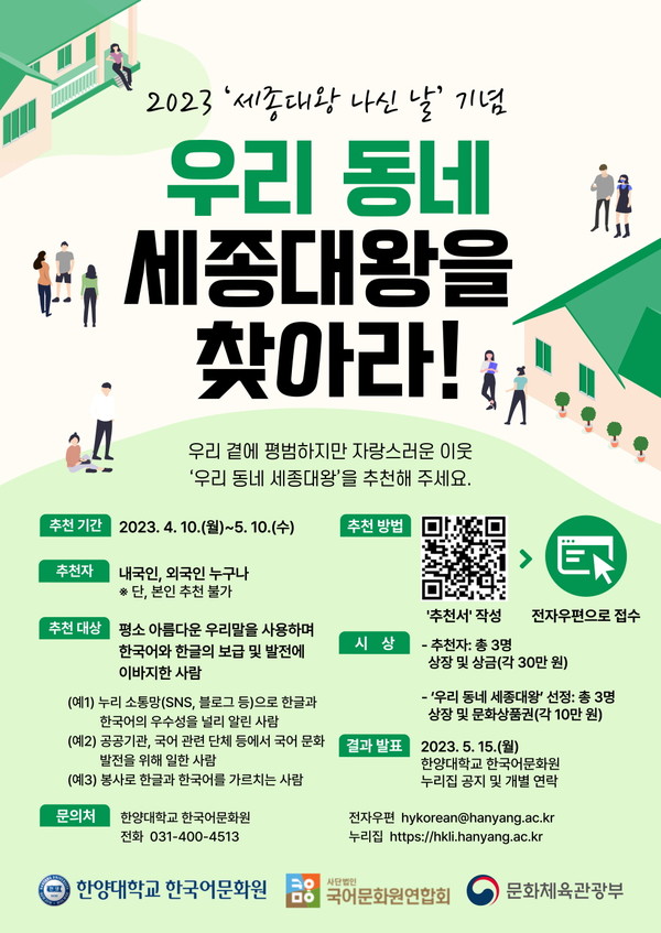 한양대학교 한국어문화원(원장 김태경)은 세종대왕 나신 날을 맞이하여 ‘우리 동네 세종대왕을 찾아라’ 공모전을 개최한다. 한양대학교 한국어문화원은 2010년 문화체육관광부가 지정한 경기 지역 거점 국어문화원이다.