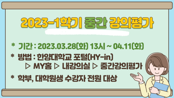 담당 부서 : 학사팀 게시 기간 : 2023.03.28 ~ 2023.04.10 미디어보드 newsh@hanyang.ac.kr 다른기사 보기 저작권자 © 뉴스H 무단전재 및 재배포 금지 당신만 안 본 뉴스 [포토스토리] "AI 시대 해답은 브랜딩", 오세훈 서울시장의 경영학 특강 현장 Into the Creation 2025, 창작자들의 꿈에 날개를 이찬규 학생, 사이버·우주 융합연구로 2025 사이버안보논문공모전 대상 수상 한양대, '2026 QS 지속가능성 순위' 세계 161위, 국내 4위 기록 해커톤에서 인턴십까지, 현대차 사내 스타트업에 다녀오다 [창업지원단 인턴십 경험기] [포토스토리] 한양 속에 사회혁신을 품다, SSIR 먼슬리 콜로키움 현장 행복은 좋은 경험의 ‘빈도’에서, 서은국 교수와 함께한 한양인의 힐링콘서트 현장 [포토스토리] "AI 시대 해답은 브랜딩", 오세훈 서울시장의 경영학 특강 현장 댓글삭제 삭제한 댓글은 다시 복구할 수 없습니다. 그래도 삭제하시겠습니까? 비밀번호 닫기 기사 댓글 0 댓글 접기 로그인 후 이용 가능합니다. 댓글 내용입력 비회원 로그인 이름 비밀번호 댓글 내용입력 댓글쓰기 계정을 선택하시면 로그인·계정인증을 통해 댓글을 남기실 수 있습니다. 회원 로그인 비회원 글쓰기 이름 비밀번호 자동등록방지 로그인 옵션 창닫기 기획기사 [포토스토리] "AI 시대 해답은 브랜딩", 오세훈 서울시장의 경영학 특강 현장 Into the Creation 2025, 창작자들의 꿈에 날개를 해커톤에서 인턴십까지, 현대차 사내 스타트업에 다녀오다 [창업지원단 인턴십 경험기] [포토스토리] 한양 속에 사회혁신을 품다, SSIR 먼슬리 콜로키움 현장 행복은 좋은 경험의 ‘빈도’에서, 서은국 교수와 함께한 한양인의 힐링콘서트 현장 [카드뉴스] '한양대학교 SDGs? 알고 보니 내 일상 속에 있었다!' 1편