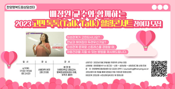 담당 부서 : 한양행복드림상담센터 게시 기간 : 2023.05.10 ~ 2023.05.23 관련기사 연인관계 고민인 사람 여기 모여라, '고민 톡톡(talk talk) 힐링콘서트' 방문기! 미디어보드 newsh@hanyang.ac.kr 다른기사 보기 저작권자 © 뉴스H 무단전재 및 재배포 금지 당신만 안 본 뉴스 [포토스토리] "AI 시대 해답은 브랜딩", 오세훈 서울시장의 경영학 특강 현장 Into the Creation 2025, 창작자들의 꿈에 날개를 이찬규 학생, 사이버·우주 융합연구로 2025 사이버안보논문공모전 대상 수상 한양대, '2026 QS 지속가능성 순위' 세계 161위, 국내 4위 기록 해커톤에서 인턴십까지, 현대차 사내 스타트업에 다녀오다 [창업지원단 인턴십 경험기] [포토스토리] 한양 속에 사회혁신을 품다, SSIR 먼슬리 콜로키움 현장 행복은 좋은 경험의 ‘빈도’에서, 서은국 교수와 함께한 한양인의 힐링콘서트 현장 [포토스토리] "AI 시대 해답은 브랜딩", 오세훈 서울시장의 경영학 특강 현장 댓글삭제 삭제한 댓글은 다시 복구할 수 없습니다. 그래도 삭제하시겠습니까? 비밀번호 닫기 기사 댓글 0 댓글 접기 로그인 후 이용 가능합니다. 댓글 내용입력 비회원 로그인 이름 비밀번호 댓글 내용입력 댓글쓰기 계정을 선택하시면 로그인·계정인증을 통해 댓글을 남기실 수 있습니다. 회원 로그인 비회원 글쓰기 이름 비밀번호 자동등록방지 로그인 옵션 창닫기 기획기사 [포토스토리] "AI 시대 해답은 브랜딩", 오세훈 서울시장의 경영학 특강 현장 Into the Creation 2025, 창작자들의 꿈에 날개를 해커톤에서 인턴십까지, 현대차 사내 스타트업에 다녀오다 [창업지원단 인턴십 경험기] [포토스토리] 한양 속에 사회혁신을 품다, SSIR 먼슬리 콜로키움 현장 행복은 좋은 경험의 ‘빈도’에서, 서은국 교수와 함께한 한양인의 힐링콘서트 현장 [카드뉴스] '한양대학교 SDGs? 알고 보니 내 일상 속에 있었다!' 1편