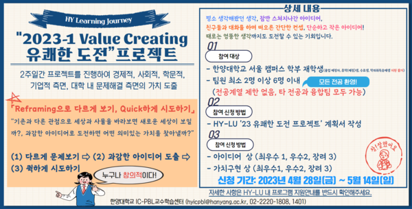 담당 부서 : IC-PBL교수학습센터 게시 기간 : 2023.05.11 ~ 2023.05.14 관련기사 Value Creating 유쾌한 도전 프로젝트, 제한된 자원과 창의적 아이디어로 가치를 창출하라! 미디어보드 newsh@hanyang.ac.kr 다른기사 보기 저작권자 © 뉴스H 무단전재 및 재배포 금지 당신만 안 본 뉴스 [포토스토리] "AI 시대 해답은 브랜딩", 오세훈 서울시장의 경영학 특강 현장 Into the Creation 2025, 창작자들의 꿈에 날개를 이찬규 학생, 사이버·우주 융합연구로 2025 사이버안보논문공모전 대상 수상 한양대, '2026 QS 지속가능성 순위' 세계 161위, 국내 4위 기록 해커톤에서 인턴십까지, 현대차 사내 스타트업에 다녀오다 [창업지원단 인턴십 경험기] [포토스토리] 한양 속에 사회혁신을 품다, SSIR 먼슬리 콜로키움 현장 행복은 좋은 경험의 ‘빈도’에서, 서은국 교수와 함께한 한양인의 힐링콘서트 현장 [포토스토리] "AI 시대 해답은 브랜딩", 오세훈 서울시장의 경영학 특강 현장 댓글삭제 삭제한 댓글은 다시 복구할 수 없습니다. 그래도 삭제하시겠습니까? 비밀번호 닫기 기사 댓글 0 댓글 접기 로그인 후 이용 가능합니다. 댓글 내용입력 비회원 로그인 이름 비밀번호 댓글 내용입력 댓글쓰기 계정을 선택하시면 로그인·계정인증을 통해 댓글을 남기실 수 있습니다. 회원 로그인 비회원 글쓰기 이름 비밀번호 자동등록방지 로그인 옵션 창닫기 기획기사 [포토스토리] "AI 시대 해답은 브랜딩", 오세훈 서울시장의 경영학 특강 현장 Into the Creation 2025, 창작자들의 꿈에 날개를 해커톤에서 인턴십까지, 현대차 사내 스타트업에 다녀오다 [창업지원단 인턴십 경험기] [포토스토리] 한양 속에 사회혁신을 품다, SSIR 먼슬리 콜로키움 현장 행복은 좋은 경험의 ‘빈도’에서, 서은국 교수와 함께한 한양인의 힐링콘서트 현장 [카드뉴스] '한양대학교 SDGs? 알고 보니 내 일상 속에 있었다!' 1편