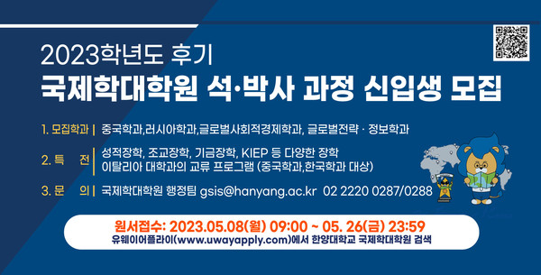 담당 부서 : 국제학부 RC 행정팀 게시 기간 : 2023.05.15 ~ 2023.05.28 미디어보드 newsh@hanyang.ac.kr 다른기사 보기 저작권자 © 뉴스H 무단전재 및 재배포 금지 당신만 안 본 뉴스 [포토스토리] "AI 시대 해답은 브랜딩", 오세훈 서울시장의 경영학 특강 현장 Into the Creation 2025, 창작자들의 꿈에 날개를 이찬규 학생, 사이버·우주 융합연구로 2025 사이버안보논문공모전 대상 수상 한양대, '2026 QS 지속가능성 순위' 세계 161위, 국내 4위 기록 해커톤에서 인턴십까지, 현대차 사내 스타트업에 다녀오다 [창업지원단 인턴십 경험기] [포토스토리] 한양 속에 사회혁신을 품다, SSIR 먼슬리 콜로키움 현장 행복은 좋은 경험의 ‘빈도’에서, 서은국 교수와 함께한 한양인의 힐링콘서트 현장 [포토스토리] "AI 시대 해답은 브랜딩", 오세훈 서울시장의 경영학 특강 현장 댓글삭제 삭제한 댓글은 다시 복구할 수 없습니다. 그래도 삭제하시겠습니까? 비밀번호 닫기 기사 댓글 0 댓글 접기 로그인 후 이용 가능합니다. 댓글 내용입력 비회원 로그인 이름 비밀번호 댓글 내용입력 댓글쓰기 계정을 선택하시면 로그인·계정인증을 통해 댓글을 남기실 수 있습니다. 회원 로그인 비회원 글쓰기 이름 비밀번호 자동등록방지 로그인 옵션 창닫기 기획기사 [포토스토리] "AI 시대 해답은 브랜딩", 오세훈 서울시장의 경영학 특강 현장 Into the Creation 2025, 창작자들의 꿈에 날개를 해커톤에서 인턴십까지, 현대차 사내 스타트업에 다녀오다 [창업지원단 인턴십 경험기] [포토스토리] 한양 속에 사회혁신을 품다, SSIR 먼슬리 콜로키움 현장 행복은 좋은 경험의 ‘빈도’에서, 서은국 교수와 함께한 한양인의 힐링콘서트 현장 [카드뉴스] '한양대학교 SDGs? 알고 보니 내 일상 속에 있었다!' 1편