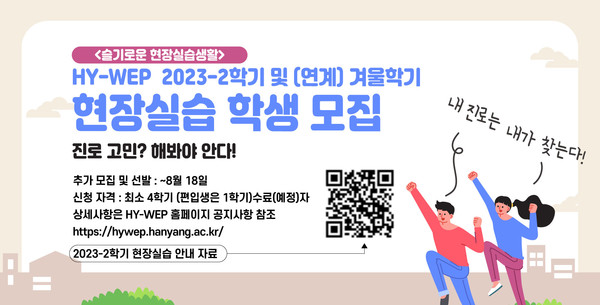 담당 부서 : 현장실습지원팀 게시 기간 : 2023.08.04 ~ 2023.08.17 미디어보드 newsh@hanyang.ac.kr 다른기사 보기 저작권자 © 뉴스H 무단전재 및 재배포 금지 당신만 안 본 뉴스 [포토스토리] "AI 시대 해답은 브랜딩", 오세훈 서울시장의 경영학 특강 현장 Into the Creation 2025, 창작자들의 꿈에 날개를 이찬규 학생, 사이버·우주 융합연구로 2025 사이버안보논문공모전 대상 수상 한양대, '2026 QS 지속가능성 순위' 세계 161위, 국내 4위 기록 해커톤에서 인턴십까지, 현대차 사내 스타트업에 다녀오다 [창업지원단 인턴십 경험기] [포토스토리] 한양 속에 사회혁신을 품다, SSIR 먼슬리 콜로키움 현장 행복은 좋은 경험의 ‘빈도’에서, 서은국 교수와 함께한 한양인의 힐링콘서트 현장 2025 중앙일보 대학평가 서울 3위, ERICA 13위 댓글삭제 삭제한 댓글은 다시 복구할 수 없습니다. 그래도 삭제하시겠습니까? 비밀번호 닫기 기사 댓글 0 댓글 접기 로그인 후 이용 가능합니다. 댓글 내용입력 비회원 로그인 이름 비밀번호 댓글 내용입력 댓글쓰기 계정을 선택하시면 로그인·계정인증을 통해 댓글을 남기실 수 있습니다. 회원 로그인 비회원 글쓰기 이름 비밀번호 자동등록방지 로그인 옵션 창닫기 기획기사 [포토스토리] "AI 시대 해답은 브랜딩", 오세훈 서울시장의 경영학 특강 현장 Into the Creation 2025, 창작자들의 꿈에 날개를 해커톤에서 인턴십까지, 현대차 사내 스타트업에 다녀오다 [창업지원단 인턴십 경험기] [포토스토리] 한양 속에 사회혁신을 품다, SSIR 먼슬리 콜로키움 현장 행복은 좋은 경험의 ‘빈도’에서, 서은국 교수와 함께한 한양인의 힐링콘서트 현장 [카드뉴스] '한양대학교 SDGs? 알고 보니 내 일상 속에 있었다!' 1편