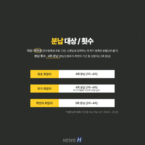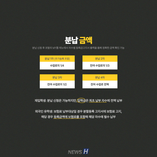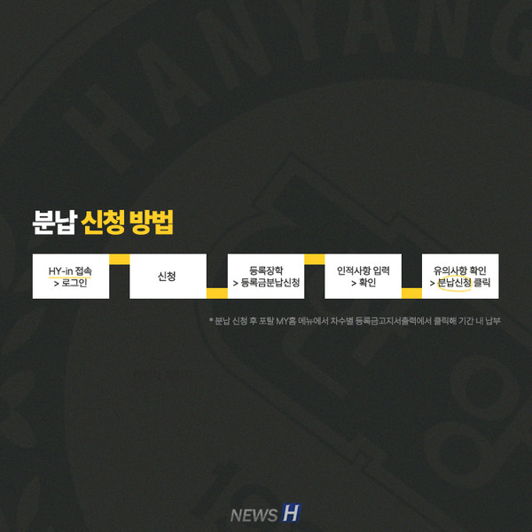 새 학기가 다가오면 설레는 마음도 잠시, 등록금이라는 경제적 부담이 생기기도 한다. 이런 한양인의 고민을 덜어주기 위해 마련된 분할 납부 제도를 소개한다. 등록금 분할 납부란 등록 기간 중 등록금을 전액으로 납부하기 어려워하는 학생을 위해 등록금을 분할해 납부하는 제도다. 카드뉴스를 통해 자세한 설명을 확인해 보자.
