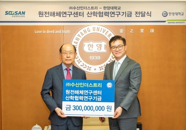 발전 플랜트 종합정비 솔루션 기업 수산인더스트리(대표 한봉섭)가 한양대 원전해체연구센터(센터장 김용수)에 산학협력 연구기금 3억원을 전달했다. 이번 기금 전달에 이어 수산인더스트리와 한양대 원전해체연구센터는 국내와 해외 시장에 진출할 수 있는 원전해체 기술 개발을 위해 협력해 나갈 계획이다.