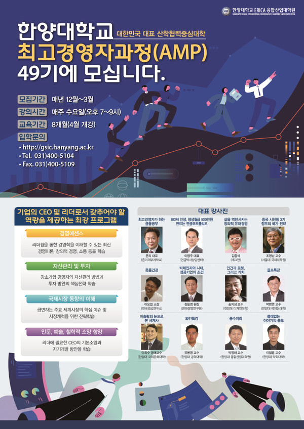 한양대 ERICA 융합산업대학원(원장 이성욱)이 금융·자산관리 등에 초점을 맞춘 제49기 최고경영자과정(AMP)을 오는 4월 개설한다고, 11일 밝혔다.