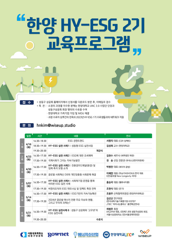 한양대가 성동구상공회와 함께 오는 16일부터 한양 HY-ESG 2기 교육프로그램을 운영한다. 이번 교육은 ESG 실천 사례를 중심으로 구성되며, 2023년 ESG 실천 프로그램에 참여했던 수료생들의 주도로 기획되었다. 수료생들의 요청에 의해 후속 프로그램이 기획되었다는 점에서 지·산·학 협력의 우수 사례로 평가받고 있다.