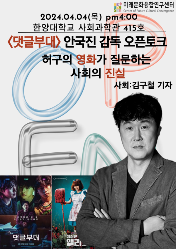 한양대학교 미래문화융합연구센터(센터장 김성수)가 오는 4월 4일, 서울 성동구 한양대학교 사회과학관에서 <댓글부대> 안국진 감독을 초청하여 ‘허구의 영화가 질문하는 사회의 진실’이라는 주제의 오픈토크를 개최한다고 한양대가 밝혔다.