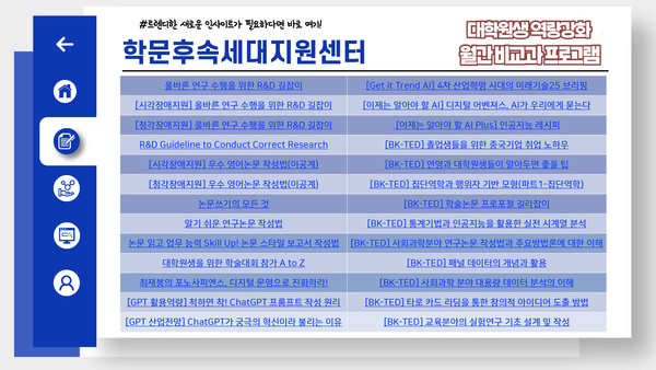 담당 부서 : 학문후속세대지원센터 게시 기간 : 2024.04.01 ~ 2024.04.14 미디어보드 newsh@hanyang.ac.kr 다른기사 보기 저작권자 © 뉴스H 무단전재 및 재배포 금지 당신만 안 본 뉴스 [포토스토리] "AI 시대 해답은 브랜딩", 오세훈 서울시장의 경영학 특강 현장 Into the Creation 2025, 창작자들의 꿈에 날개를 이찬규 학생, 사이버·우주 융합연구로 2025 사이버안보논문공모전 대상 수상 한양대, '2026 QS 지속가능성 순위' 세계 161위, 국내 4위 기록 해커톤에서 인턴십까지, 현대차 사내 스타트업에 다녀오다 [창업지원단 인턴십 경험기] [포토스토리] 한양 속에 사회혁신을 품다, SSIR 먼슬리 콜로키움 현장 행복은 좋은 경험의 ‘빈도’에서, 서은국 교수와 함께한 한양인의 힐링콘서트 현장 [포토스토리] "AI 시대 해답은 브랜딩", 오세훈 서울시장의 경영학 특강 현장 댓글삭제 삭제한 댓글은 다시 복구할 수 없습니다. 그래도 삭제하시겠습니까? 비밀번호 닫기 기사 댓글 0 댓글 접기 로그인 후 이용 가능합니다. 댓글 내용입력 비회원 로그인 이름 비밀번호 댓글 내용입력 댓글쓰기 계정을 선택하시면 로그인·계정인증을 통해 댓글을 남기실 수 있습니다. 회원 로그인 비회원 글쓰기 이름 비밀번호 자동등록방지 로그인 옵션 창닫기 기획기사 [포토스토리] "AI 시대 해답은 브랜딩", 오세훈 서울시장의 경영학 특강 현장 Into the Creation 2025, 창작자들의 꿈에 날개를 해커톤에서 인턴십까지, 현대차 사내 스타트업에 다녀오다 [창업지원단 인턴십 경험기] [포토스토리] 한양 속에 사회혁신을 품다, SSIR 먼슬리 콜로키움 현장 행복은 좋은 경험의 ‘빈도’에서, 서은국 교수와 함께한 한양인의 힐링콘서트 현장 [카드뉴스] '한양대학교 SDGs? 알고 보니 내 일상 속에 있었다!' 1편