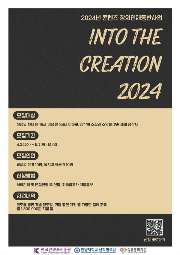 <Into the Creation 2024>는 신청일 현재 만 18세 이상, 34세 이하의 창의적 소질과 소양을 갖춘 예비 창작자 중 뮤지컬 분야(극작, 작곡)에 관심이 있으며 각 분야의 참가기준을 충족하는 경우 신청이 가능하다.