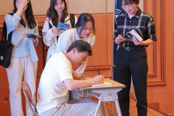 행사는 이호복 ERICA 학술정보관 부관장의 인사말을 시작으로 전한길 강연자의 강연과 질의응답, 경품추첨 및 싸인회의 식순으로 진행됐다.