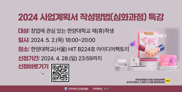 담당 부서 : 글로벌기업가센터 게시 기간 : 2024.04.23 ~ 2024.04.28 미디어보드 newsh@hanyang.ac.kr 다른기사 보기 저작권자 © 뉴스H 무단전재 및 재배포 금지 당신만 안 본 뉴스 [포토스토리] "AI 시대 해답은 브랜딩", 오세훈 서울시장의 경영학 특강 현장 Into the Creation 2025, 창작자들의 꿈에 날개를 이찬규 학생, 사이버·우주 융합연구로 2025 사이버안보논문공모전 대상 수상 한양대, '2026 QS 지속가능성 순위' 세계 161위, 국내 4위 기록 해커톤에서 인턴십까지, 현대차 사내 스타트업에 다녀오다 [창업지원단 인턴십 경험기] [포토스토리] 한양 속에 사회혁신을 품다, SSIR 먼슬리 콜로키움 현장 행복은 좋은 경험의 ‘빈도’에서, 서은국 교수와 함께한 한양인의 힐링콘서트 현장 2025 중앙일보 대학평가 서울 3위, ERICA 13위 댓글삭제 삭제한 댓글은 다시 복구할 수 없습니다. 그래도 삭제하시겠습니까? 비밀번호 닫기 기사 댓글 0 댓글 접기 로그인 후 이용 가능합니다. 댓글 내용입력 비회원 로그인 이름 비밀번호 댓글 내용입력 댓글쓰기 계정을 선택하시면 로그인·계정인증을 통해 댓글을 남기실 수 있습니다. 회원 로그인 비회원 글쓰기 이름 비밀번호 자동등록방지 로그인 옵션 창닫기 기획기사 [포토스토리] "AI 시대 해답은 브랜딩", 오세훈 서울시장의 경영학 특강 현장 Into the Creation 2025, 창작자들의 꿈에 날개를 해커톤에서 인턴십까지, 현대차 사내 스타트업에 다녀오다 [창업지원단 인턴십 경험기] [포토스토리] 한양 속에 사회혁신을 품다, SSIR 먼슬리 콜로키움 현장 행복은 좋은 경험의 ‘빈도’에서, 서은국 교수와 함께한 한양인의 힐링콘서트 현장 [카드뉴스] '한양대학교 SDGs? 알고 보니 내 일상 속에 있었다!' 1편