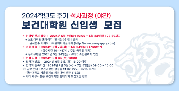 담당 부서 : 의과대학 RC 행정팀 게시 기간 : 2024.04.30 ~ 2024.05.13 미디어보드 newsh@hanyang.ac.kr 다른기사 보기 저작권자 © 뉴스H 무단전재 및 재배포 금지 당신만 안 본 뉴스 [포토스토리] "AI 시대 해답은 브랜딩", 오세훈 서울시장의 경영학 특강 현장 Into the Creation 2025, 창작자들의 꿈에 날개를 이찬규 학생, 사이버·우주 융합연구로 2025 사이버안보논문공모전 대상 수상 한양대, '2026 QS 지속가능성 순위' 세계 161위, 국내 4위 기록 해커톤에서 인턴십까지, 현대차 사내 스타트업에 다녀오다 [창업지원단 인턴십 경험기] [포토스토리] 한양 속에 사회혁신을 품다, SSIR 먼슬리 콜로키움 현장 행복은 좋은 경험의 ‘빈도’에서, 서은국 교수와 함께한 한양인의 힐링콘서트 현장 2025 중앙일보 대학평가 서울 3위, ERICA 13위 댓글삭제 삭제한 댓글은 다시 복구할 수 없습니다. 그래도 삭제하시겠습니까? 비밀번호 닫기 기사 댓글 0 댓글 접기 로그인 후 이용 가능합니다. 댓글 내용입력 비회원 로그인 이름 비밀번호 댓글 내용입력 댓글쓰기 계정을 선택하시면 로그인·계정인증을 통해 댓글을 남기실 수 있습니다. 회원 로그인 비회원 글쓰기 이름 비밀번호 자동등록방지 로그인 옵션 창닫기 기획기사 [포토스토리] "AI 시대 해답은 브랜딩", 오세훈 서울시장의 경영학 특강 현장 Into the Creation 2025, 창작자들의 꿈에 날개를 해커톤에서 인턴십까지, 현대차 사내 스타트업에 다녀오다 [창업지원단 인턴십 경험기] [포토스토리] 한양 속에 사회혁신을 품다, SSIR 먼슬리 콜로키움 현장 행복은 좋은 경험의 ‘빈도’에서, 서은국 교수와 함께한 한양인의 힐링콘서트 현장 [카드뉴스] '한양대학교 SDGs? 알고 보니 내 일상 속에 있었다!' 1편