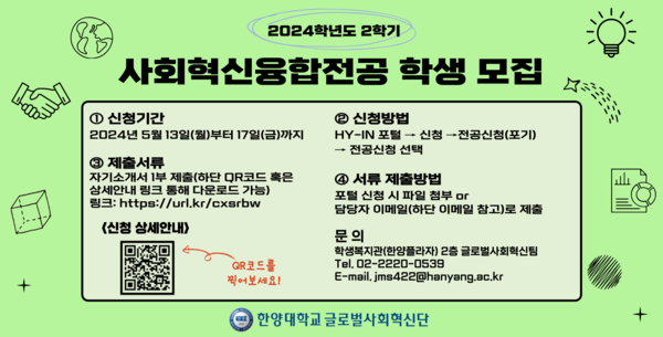 담당 부서 : 글로벌사회혁신팀(서울) 게시 기간 : 2024.05.08 ~ 2024.05.17 미디어보드 newsh@hanyang.ac.kr 다른기사 보기 저작권자 © 뉴스H 무단전재 및 재배포 금지 당신만 안 본 뉴스 [포토스토리] "AI 시대 해답은 브랜딩", 오세훈 서울시장의 경영학 특강 현장 Into the Creation 2025, 창작자들의 꿈에 날개를 이찬규 학생, 사이버·우주 융합연구로 2025 사이버안보논문공모전 대상 수상 한양대, '2026 QS 지속가능성 순위' 세계 161위, 국내 4위 기록 해커톤에서 인턴십까지, 현대차 사내 스타트업에 다녀오다 [창업지원단 인턴십 경험기] [포토스토리] 한양 속에 사회혁신을 품다, SSIR 먼슬리 콜로키움 현장 행복은 좋은 경험의 ‘빈도’에서, 서은국 교수와 함께한 한양인의 힐링콘서트 현장 [포토스토리] "AI 시대 해답은 브랜딩", 오세훈 서울시장의 경영학 특강 현장 댓글삭제 삭제한 댓글은 다시 복구할 수 없습니다. 그래도 삭제하시겠습니까? 비밀번호 닫기 기사 댓글 0 댓글 접기 로그인 후 이용 가능합니다. 댓글 내용입력 비회원 로그인 이름 비밀번호 댓글 내용입력 댓글쓰기 계정을 선택하시면 로그인·계정인증을 통해 댓글을 남기실 수 있습니다. 회원 로그인 비회원 글쓰기 이름 비밀번호 자동등록방지 로그인 옵션 창닫기 기획기사 [포토스토리] "AI 시대 해답은 브랜딩", 오세훈 서울시장의 경영학 특강 현장 Into the Creation 2025, 창작자들의 꿈에 날개를 해커톤에서 인턴십까지, 현대차 사내 스타트업에 다녀오다 [창업지원단 인턴십 경험기] [포토스토리] 한양 속에 사회혁신을 품다, SSIR 먼슬리 콜로키움 현장 행복은 좋은 경험의 ‘빈도’에서, 서은국 교수와 함께한 한양인의 힐링콘서트 현장 [카드뉴스] '한양대학교 SDGs? 알고 보니 내 일상 속에 있었다!' 1편
