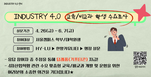 담당 부서 : INDUSTRY 4.0 센터 게시 기간 : 2024.05.27 ~ 2024.06.07 미디어보드 newsh@hanyang.ac.kr 다른기사 보기 저작권자 © 뉴스H 무단전재 및 재배포 금지 당신만 안 본 뉴스 [포토스토리] "AI 시대 해답은 브랜딩", 오세훈 서울시장의 경영학 특강 현장 Into the Creation 2025, 창작자들의 꿈에 날개를 이찬규 학생, 사이버·우주 융합연구로 2025 사이버안보논문공모전 대상 수상 한양대, '2026 QS 지속가능성 순위' 세계 161위, 국내 4위 기록 해커톤에서 인턴십까지, 현대차 사내 스타트업에 다녀오다 [창업지원단 인턴십 경험기] [포토스토리] 한양 속에 사회혁신을 품다, SSIR 먼슬리 콜로키움 현장 행복은 좋은 경험의 ‘빈도’에서, 서은국 교수와 함께한 한양인의 힐링콘서트 현장 2025 중앙일보 대학평가 서울 3위, ERICA 13위 댓글삭제 삭제한 댓글은 다시 복구할 수 없습니다. 그래도 삭제하시겠습니까? 비밀번호 닫기 기사 댓글 0 댓글 접기 로그인 후 이용 가능합니다. 댓글 내용입력 비회원 로그인 이름 비밀번호 댓글 내용입력 댓글쓰기 계정을 선택하시면 로그인·계정인증을 통해 댓글을 남기실 수 있습니다. 회원 로그인 비회원 글쓰기 이름 비밀번호 자동등록방지 로그인 옵션 창닫기 기획기사 [포토스토리] "AI 시대 해답은 브랜딩", 오세훈 서울시장의 경영학 특강 현장 Into the Creation 2025, 창작자들의 꿈에 날개를 해커톤에서 인턴십까지, 현대차 사내 스타트업에 다녀오다 [창업지원단 인턴십 경험기] [포토스토리] 한양 속에 사회혁신을 품다, SSIR 먼슬리 콜로키움 현장 행복은 좋은 경험의 ‘빈도’에서, 서은국 교수와 함께한 한양인의 힐링콘서트 현장 [카드뉴스] '한양대학교 SDGs? 알고 보니 내 일상 속에 있었다!' 1편