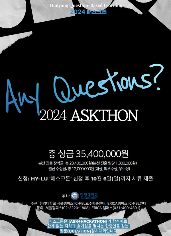 이번 행사를 공동주관하는 IC-PBL교수학습센터는 ‘애스크톤에 참여하는 자체로 기존의 지식과 답을 답습하는 학습을 벗어나게 되고, 혁신적인 질문 대회에 도전하는 ‘탐험하는 한양인’으로서 대학생활 전체에서의 한 획을 스스로 만드는 경험을 얻게 될 것‘이라고 밝혔다.