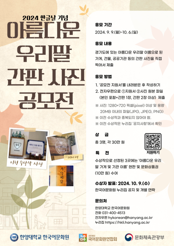 한양대학교 한국어문화원(원장 김태경)은 문화체육관광부 주최로 ‘2024 경기도 아름다운 우리말 간판 사진 공모전’을 개최한다고 11일 밝혔다. 본 공모전은 2015년에 시작되어, 경기도민이 한글의 아름다움을 경험하고 우리말에 대한 자부심을 느낄 수 있도록 기획되었다.