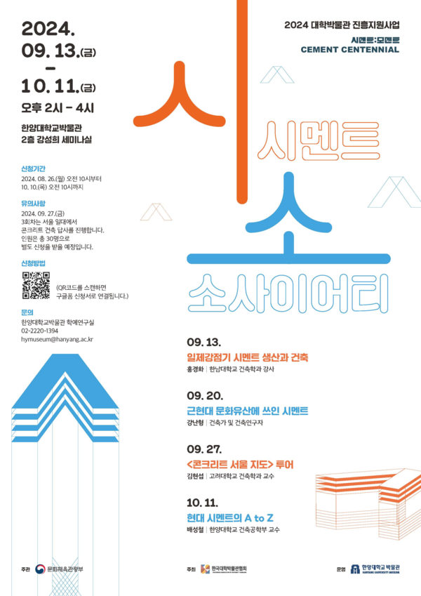 시멘트의 다양한 사회적 역할을 조명하고자 기획된 <시멘트 소사이어티>는 강연 3회와 답사 1회로 구성되어 있으며, 한양대학교박물관 2층 강성희 세미나실에서 오프라인으로 진행된다.