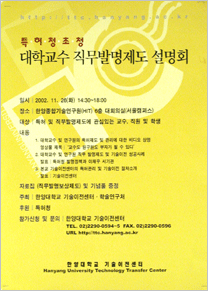 지난달 26일, 본교 한양종합기술연구원 6층 대회의실에서는 '대학교수 직무발명제도 설명회'가 개최됐다. 특허청 초청으로 본교 기술이전센터와 학술연구처가 주관한 이번 행사는 매년 증가하고 있는 대학 연구기관들의 특허출원을 돕고 직무발명에 대한 이해를 돕기 위해 마련됐다. 이번 설명회에는 특허 및 직무발명제도에 관심 있는 교수, 직원 및 학생 150여명이 참가해 특허제도에 대한 본교 구성원들의 높은 관심을 증명했다.