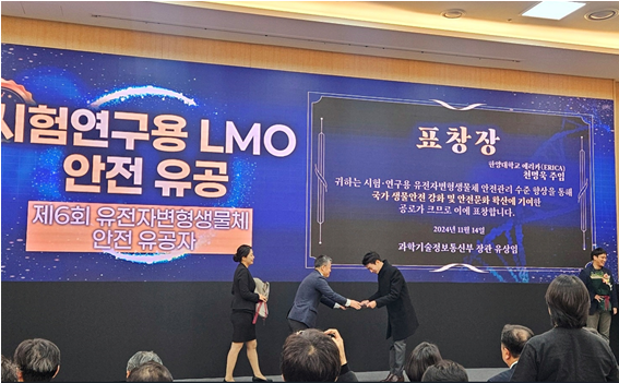 매년 3명에게만 수여되는 시험·연구용 LMO 안전 유공자 표창은 연구책임자 2명과 기관생물안전관리자 1명이 선정되며, 올해는 천명욱 주임이 그 영예를 안았다.