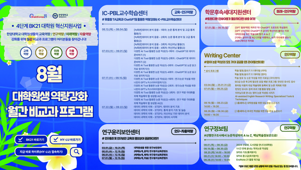 담당 부서 : 학문후속세대지원센터 게시 기간 : 2024.07.31 ~ 2024.08.13 미디어보드 newsh@hanyang.ac.kr 다른기사 보기 저작권자 © 뉴스H 무단전재 및 재배포 금지 당신만 안 본 뉴스 [포토스토리] "AI 시대 해답은 브랜딩", 오세훈 서울시장의 경영학 특강 현장 Into the Creation 2025, 창작자들의 꿈에 날개를 이찬규 학생, 사이버·우주 융합연구로 2025 사이버안보논문공모전 대상 수상 한양대, '2026 QS 지속가능성 순위' 세계 161위, 국내 4위 기록 해커톤에서 인턴십까지, 현대차 사내 스타트업에 다녀오다 [창업지원단 인턴십 경험기] [포토스토리] 한양 속에 사회혁신을 품다, SSIR 먼슬리 콜로키움 현장 행복은 좋은 경험의 ‘빈도’에서, 서은국 교수와 함께한 한양인의 힐링콘서트 현장 2025 중앙일보 대학평가 서울 3위, ERICA 13위 댓글삭제 삭제한 댓글은 다시 복구할 수 없습니다. 그래도 삭제하시겠습니까? 비밀번호 닫기 기사 댓글 0 댓글 접기 로그인 후 이용 가능합니다. 댓글 내용입력 비회원 로그인 이름 비밀번호 댓글 내용입력 댓글쓰기 계정을 선택하시면 로그인·계정인증을 통해 댓글을 남기실 수 있습니다. 회원 로그인 비회원 글쓰기 이름 비밀번호 자동등록방지 로그인 옵션 창닫기 기획기사 [포토스토리] "AI 시대 해답은 브랜딩", 오세훈 서울시장의 경영학 특강 현장 Into the Creation 2025, 창작자들의 꿈에 날개를 해커톤에서 인턴십까지, 현대차 사내 스타트업에 다녀오다 [창업지원단 인턴십 경험기] [포토스토리] 한양 속에 사회혁신을 품다, SSIR 먼슬리 콜로키움 현장 행복은 좋은 경험의 ‘빈도’에서, 서은국 교수와 함께한 한양인의 힐링콘서트 현장 [카드뉴스] '한양대학교 SDGs? 알고 보니 내 일상 속에 있었다!' 1편
