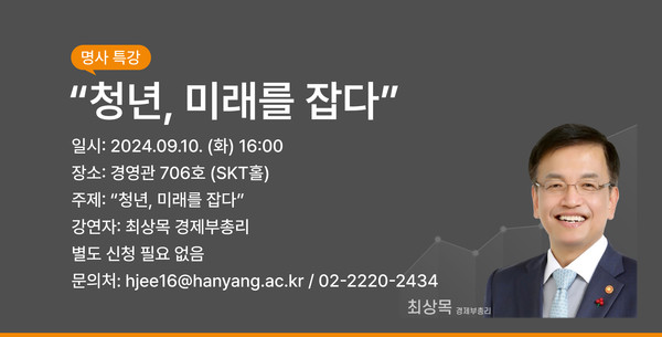 담당 부서 : 경영대학 RC 행정팀 게시 기간 : 2024.09.02 ~ 2024.09.10 미디어보드 newsh@hanyang.ac.kr 다른기사 보기 저작권자 © 뉴스H 무단전재 및 재배포 금지 당신만 안 본 뉴스 [포토스토리] "AI 시대 해답은 브랜딩", 오세훈 서울시장의 경영학 특강 현장 Into the Creation 2025, 창작자들의 꿈에 날개를 이찬규 학생, 사이버·우주 융합연구로 2025 사이버안보논문공모전 대상 수상 한양대, '2026 QS 지속가능성 순위' 세계 161위, 국내 4위 기록 해커톤에서 인턴십까지, 현대차 사내 스타트업에 다녀오다 [창업지원단 인턴십 경험기] [포토스토리] 한양 속에 사회혁신을 품다, SSIR 먼슬리 콜로키움 현장 행복은 좋은 경험의 ‘빈도’에서, 서은국 교수와 함께한 한양인의 힐링콘서트 현장 2025 중앙일보 대학평가 서울 3위, ERICA 13위 댓글삭제 삭제한 댓글은 다시 복구할 수 없습니다. 그래도 삭제하시겠습니까? 비밀번호 닫기 기사 댓글 0 댓글 접기 로그인 후 이용 가능합니다. 댓글 내용입력 비회원 로그인 이름 비밀번호 댓글 내용입력 댓글쓰기 계정을 선택하시면 로그인·계정인증을 통해 댓글을 남기실 수 있습니다. 회원 로그인 비회원 글쓰기 이름 비밀번호 자동등록방지 로그인 옵션 창닫기 기획기사 [포토스토리] "AI 시대 해답은 브랜딩", 오세훈 서울시장의 경영학 특강 현장 Into the Creation 2025, 창작자들의 꿈에 날개를 해커톤에서 인턴십까지, 현대차 사내 스타트업에 다녀오다 [창업지원단 인턴십 경험기] [포토스토리] 한양 속에 사회혁신을 품다, SSIR 먼슬리 콜로키움 현장 행복은 좋은 경험의 ‘빈도’에서, 서은국 교수와 함께한 한양인의 힐링콘서트 현장 [카드뉴스] '한양대학교 SDGs? 알고 보니 내 일상 속에 있었다!' 1편